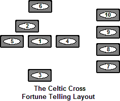 The Celtic Cross is a layout based on Tarot reading that can be adapted to fortune telling with dominoes.  The subject draws ten tiles from the shuffled boneyard, one at a time, and sets them in front of the interpreter.  The interpreter takes the tiles, in sequence, and arranges them as illustrated in the diagram below, being careful not to change their orientation.