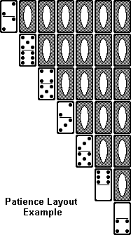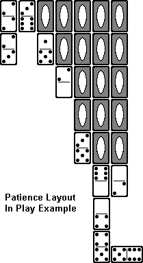 PatienceA solitaire game for one player, which is played with a Double-Six domino set, and is a domino version of the playing-card game of the same name. Play: The dominoes are shuffled, facedown, and then seven columns of tiles are laid-out, with one tile in the first column, two in the second, three in the third, and so on. All the tiles should be facedown except for the bottom tile in each column which should be turned face-up. The player then places any face-up tiles, so they are connecting with matching ends, to any of the other face-up tiles, and turning any facedown tile, above it in the column, face-up, as they go. Should the last tile in a column be moved leaving an "empty" space then a player may fill it with any face-up tile including any connecting following sequence of tiles. The object of the game is to have all the tiles turned face-up and in sequence. Note, that when turning a facedown tile up, you have to be consistent in keeping the orientation of the tiles the same throughout the game, and when moving any face-up tile(s) you have to keep the same vertical orientation and not turn any tiles around, so the top suit becomes the bottom suit.