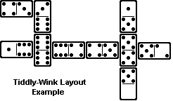 Tiddly-WinkAlso known as Tiddle-a-Wink. A simple variation of the block-type domino game, played by two to six players using a Double-Six domino set and a score-sheet. Play: The dominoes are shuffled, facedown, then each player draws seven tiles that only they can look at. Any remaining dominoes are set aside and not used in further play.