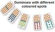 General Western Domino Attributes Western style double-square dominoes, like the standard Double-Sixes through to the less common Double-Eighteens, will all have some common attributes and features associated with them. The common standard Western domino sets found today may come marked with a differing number of spots and have a varying number of tiles, but all these sets have some common attributes and features. Each tile in any Western domino set is twice as long as it is wide, and so is known as a "double-square". The tiles are divided in half, widthways, by a centrally marked line (known as a bar, divider, or centre), with each end, either side of the dividing line, bearing one of a number of suits. Suits are marked on the tile as a number of spots (or pips) ranging from 0 (none or blank) up to possibly as many as eighteen, depending on the type and size of domino set. Domino Spots Originally, domino spots where made